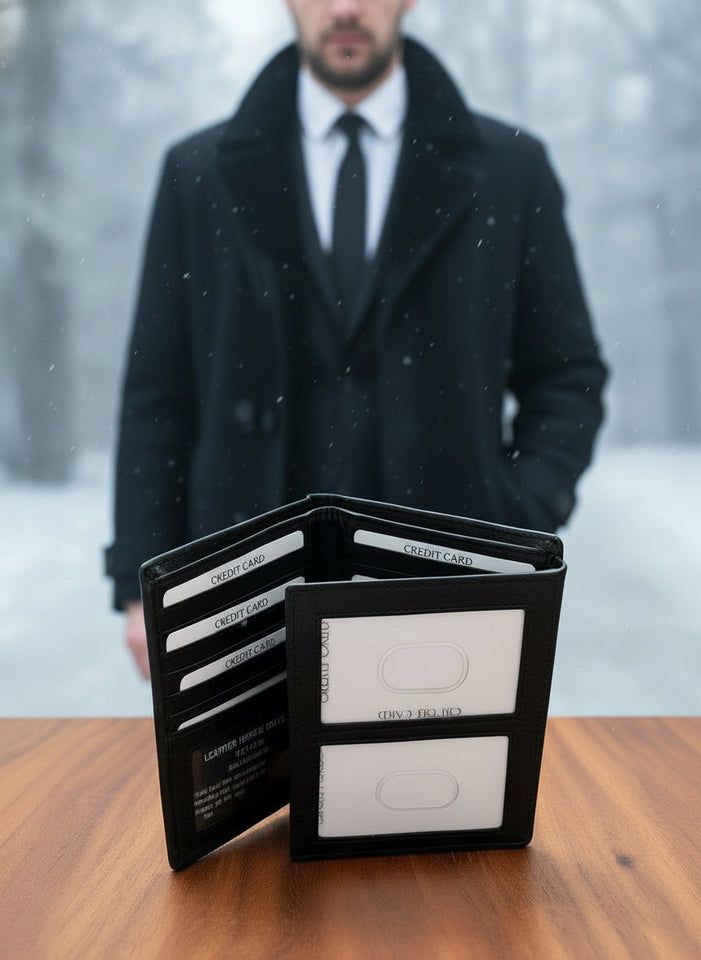 RFID Protected trifold leather wallet with 11 Credit card slots, cash compartment with divider